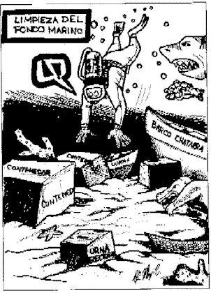 The cartoon, appearing in the "Noticiero," September 8, depicts a diver (with "A.W.A.R.E." written on his scuba tank) collecting trash. Among the items found on the ocean floor are containers, an old boat, a voter election box, a battery and a dinosaur (why not). A fish with tumors (caused by polluted waters) and a hungry shark look on. All Manzanillo and Colima newspapers supported the beach cleanup. |