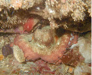 Almost all times of the year, Manzanillo's shallow reefs and shores are teeming with octopus. Though well camouflaged, with a little practice (or an experienced guide) you can pick one out. For protection, they pick up empty shells and rocks, and use the suction cups on their tentacles to draw them around their bodies to form a hard barrier. You can recognize the den of an octopus because of the array of small clam and mussel shells around its entrance. Small bivalves are a favorite food of our 8-armed friend. On the second day of filming, the Discovery crew was lucky to find an unusual event--an octopus killing a porcupine puffer.