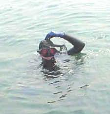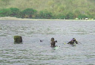 Beto and Fernando of the Discovery Channel join Susan Dearing of Underworld Scuba as she prepares to descend on the stern of the shipwreck. |