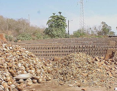 The bricks will be restacked repeatedly so that they dry evenly. It is then time for curing the bricks. It is amazing to note that this is a process that uses everything natural from the land. Other than the man-made metal mold, and a wheelbarrow, there is nothing used in the process of brick making that is artificial. A space is cleared to build an oven, made from the bricks themselves. bricks are stacked with spaces in between them, with several hollow shafts that will be later filled with coconut shells and scrap wood. |