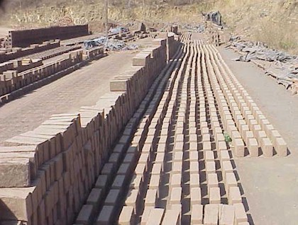 keep it from drying out. The soft mixture is scooped into a mold, and the excess is skimmed off the top by hand. Often the brick maker will finish off each mold with a special flourish--his "signature," or handprint. They work fast; they're paid by the bricks they produce. An average worker can make 400-500 bricks per day. Once the mold is removed (and there are various molds for different types and sizes of bricks), the brick is allowed to sun dry. Once the bricks have begun to air-dry on the flat area, they will be turned repeatedly so that all sides can dry equally. |