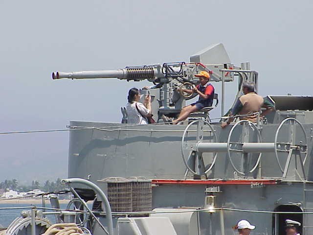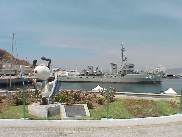 Koens is also responsible for Manzanillo being chosen for the only "Snoopy" statue outside of the United states. (Charles Schultz was one of Minnesota's most famous residents.) At right: "Snoopy," sharing his photo op with the Mexican Navy training vessel, holds a sailfish (Manzanillo's symbol as "Sailfish Capital of the World") and a Northern Pike (Minnesota's claim to fame). |