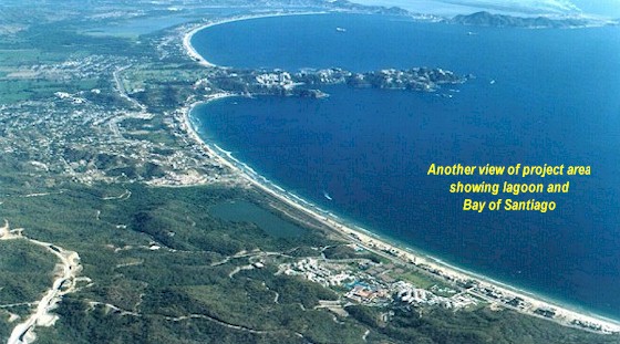 In this aerial view of "Bahia de Oro" both Manzanillo Bay (upper) and Santiago Bay (lower) are shown. Dividing the twin bays is the Peninsula de Santiago. The lagoon to be joined to the sea can be seen close to the center of the photo. Aerial photography by John Frost, well known photographer of Manzanillo and the Pacific Coast for more than 25 years.
