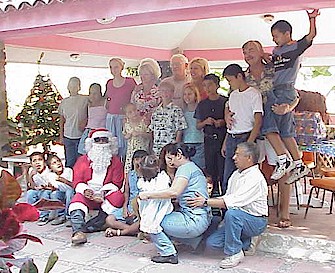 Ambassador Bob (on right, holding one boy and hugging another) at the Los Angelitos Casa Hogar at Christmastime. Bob and his family brought gifts to the children, and talked Santa (Manny Fuentes) into coming along to pass them out.