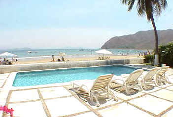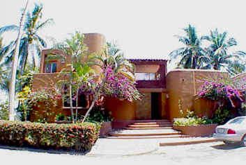 On left, side yard showing bamboo and coconut palms. On right, upstairs terrace, facing north to the Juluapan Peninsula. |