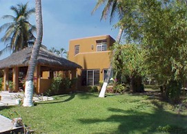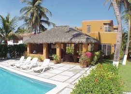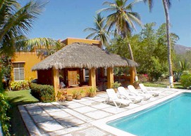 Views of the back side of the home that opens to the beach. The thatched roof area is the living/dining area shown in the interior views. |
